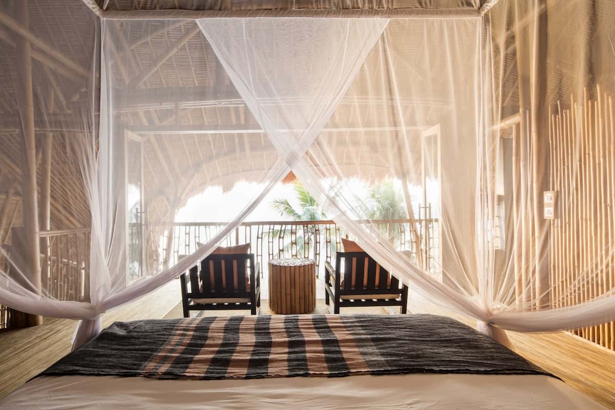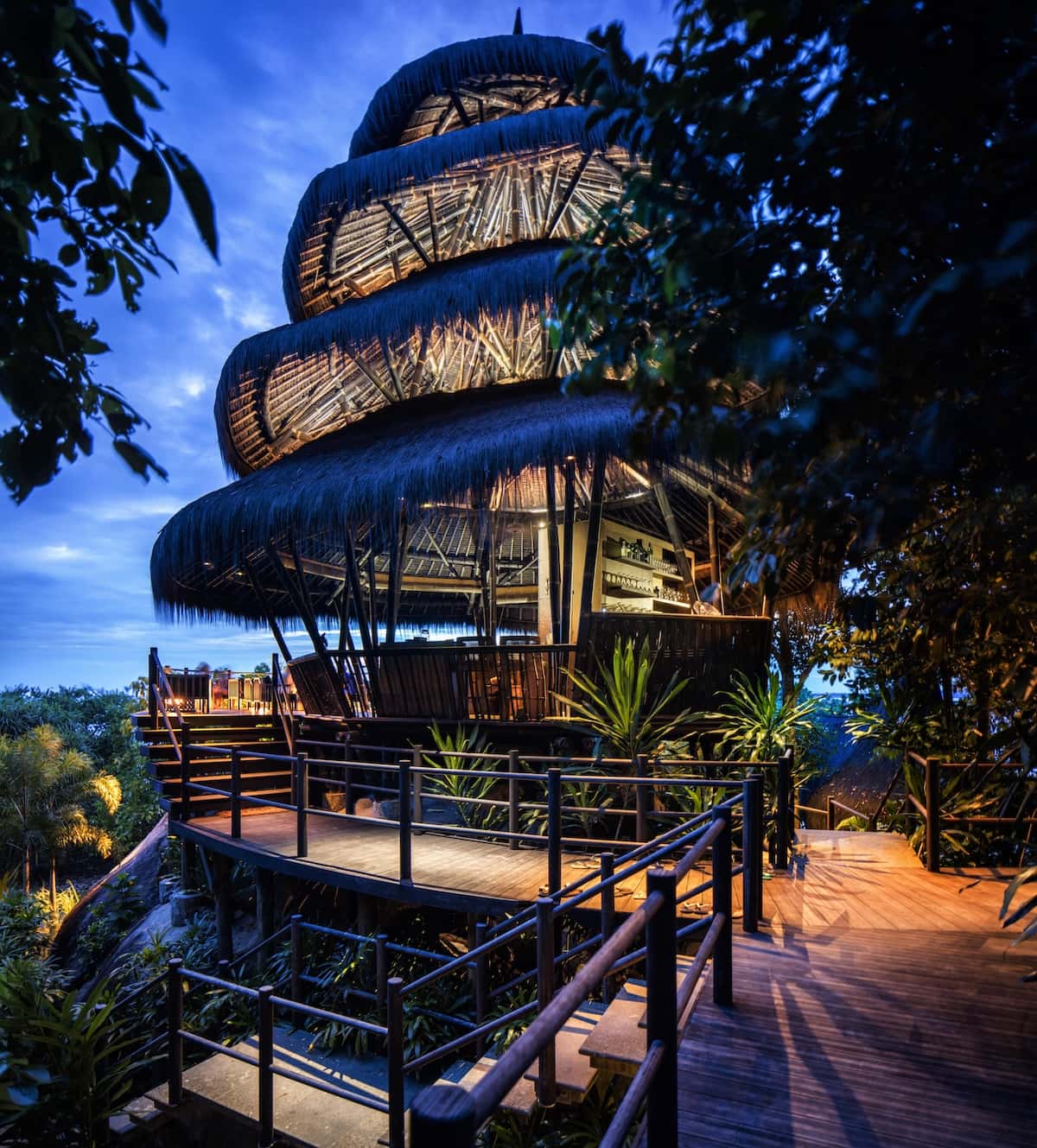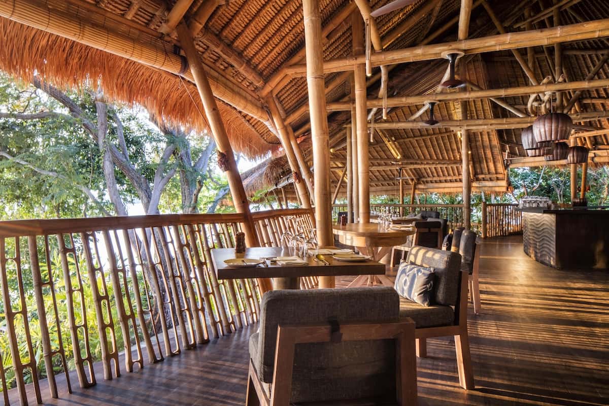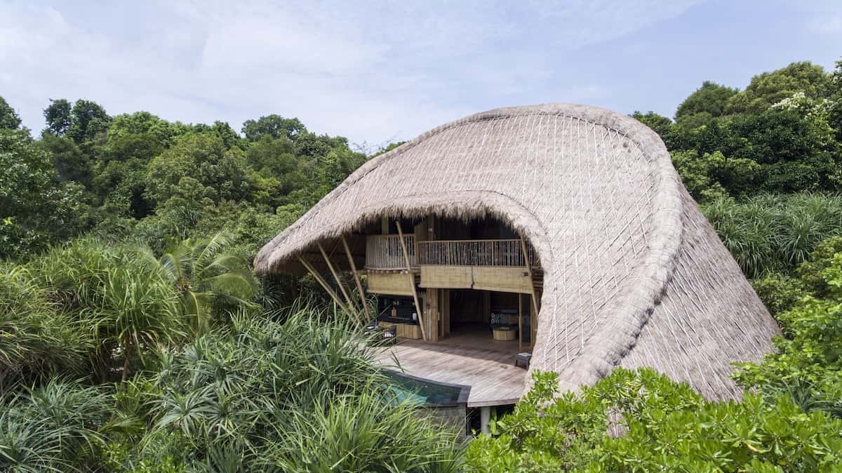 The bare, beautiful bamboo villas melt into hillsides and coastline – two open floors with a curved sofa that mirrors the bay below, living space on the ground level, a bedroom up the spiral staircase.